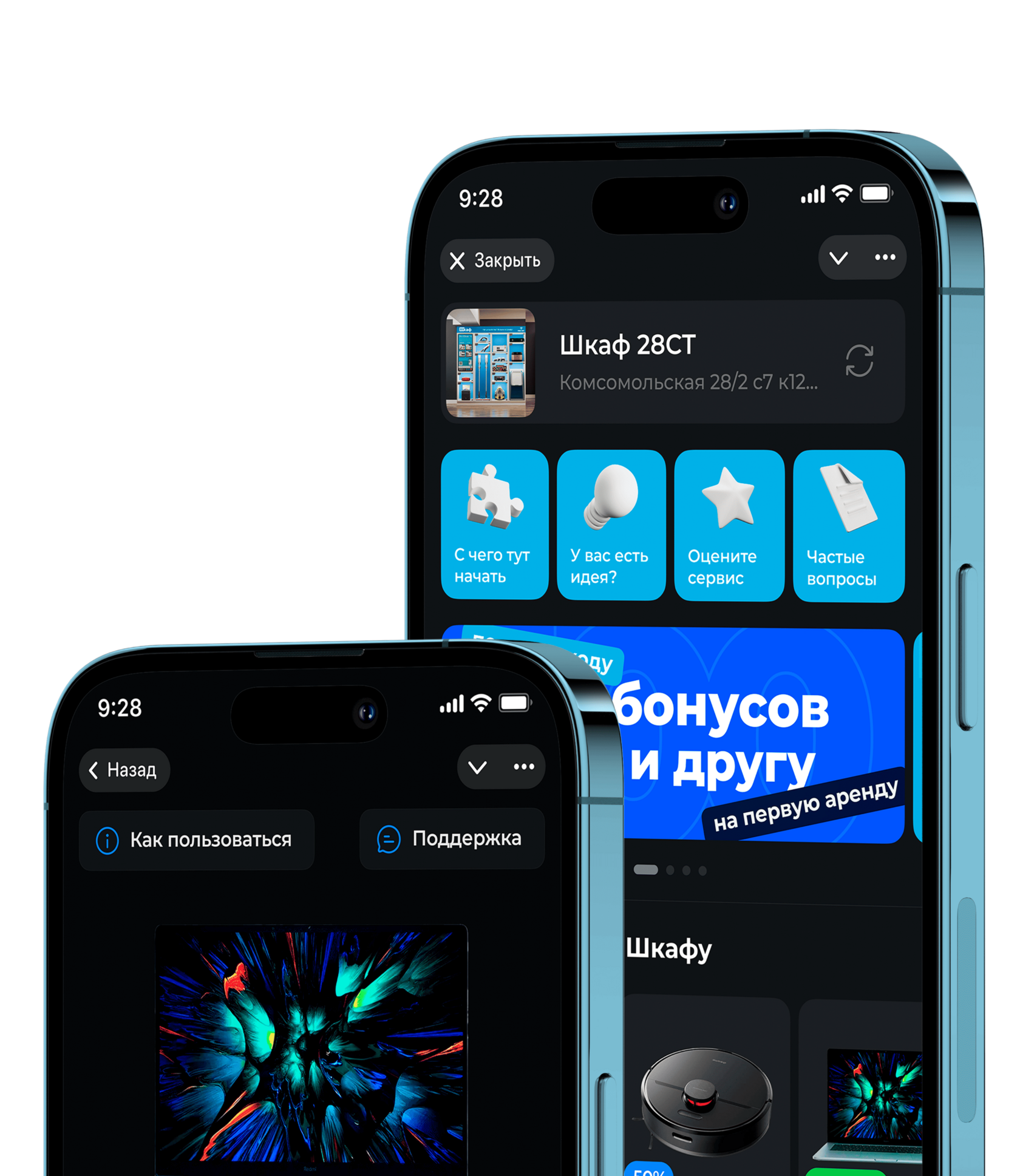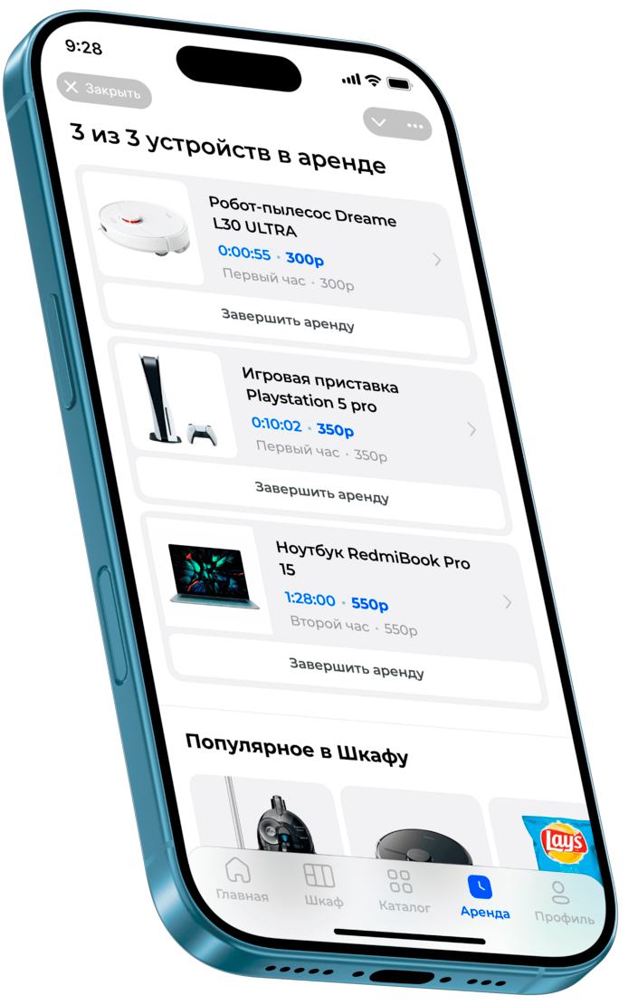 Использовать Шкаф и управлять арендой можно через наше приложение. Это очень удобно! А ещё у каждого Шкафа есть бесплатный Wi-Fi.